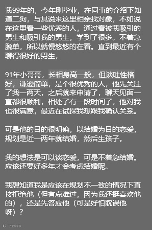 今日投稿:99年小姑娘遇到91年心动男生,发展很顺利,男生最近在试探想确认关系(想以结婚为目的恋爱,规划一到两年结婚),女生暂不考虑结婚只想谈恋爱。女生想知道该怎么办?