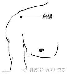 肩髃——将上臂外展平举,肩关节部即可呈现出两个凹窝,前面前面一个凹窝中即为本穴。
