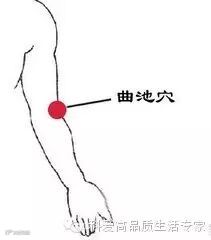 曲池——在手肘部,左右各一个,属由手阳明大肠经穴。取穴时,正坐屈肘,肘部横纹的尽头,有凹陷处即为此穴。