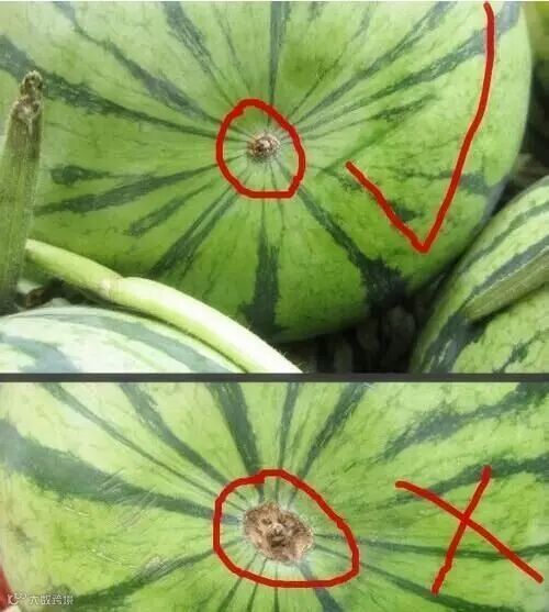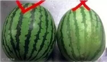 首先要看西瓜的头和尾,也就是西瓜的脐部和瓜蒂,如果都凹陷较深,都是好瓜。