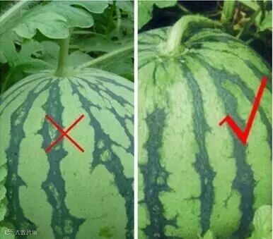 再看瓜皮是否光滑鲜亮,纹形是否清晰,从纹路来看,纹路整齐的,皮色较深,纹路呈墨绿色,底面发黄的,就是好瓜。
