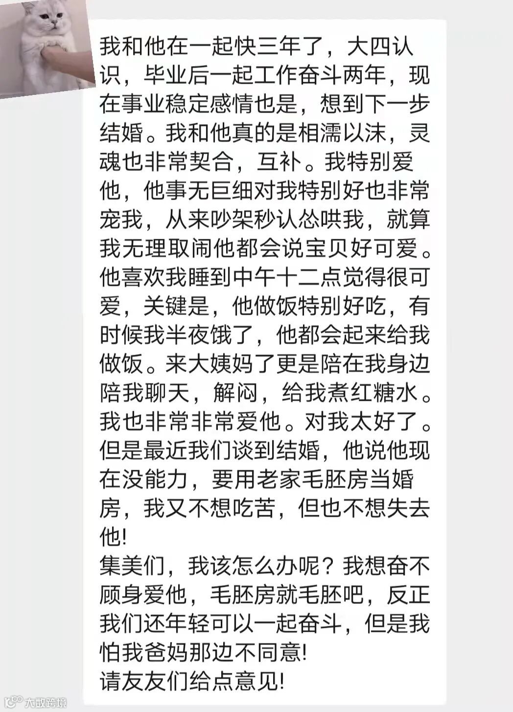 投稿:男朋友对我非常非常好,半夜饿了会做饭给我吃,来大姨妈会陪着我……可是只能拿老家毛坯房当婚房,我不想失去他,又不想吃苦,我该怎么办?
