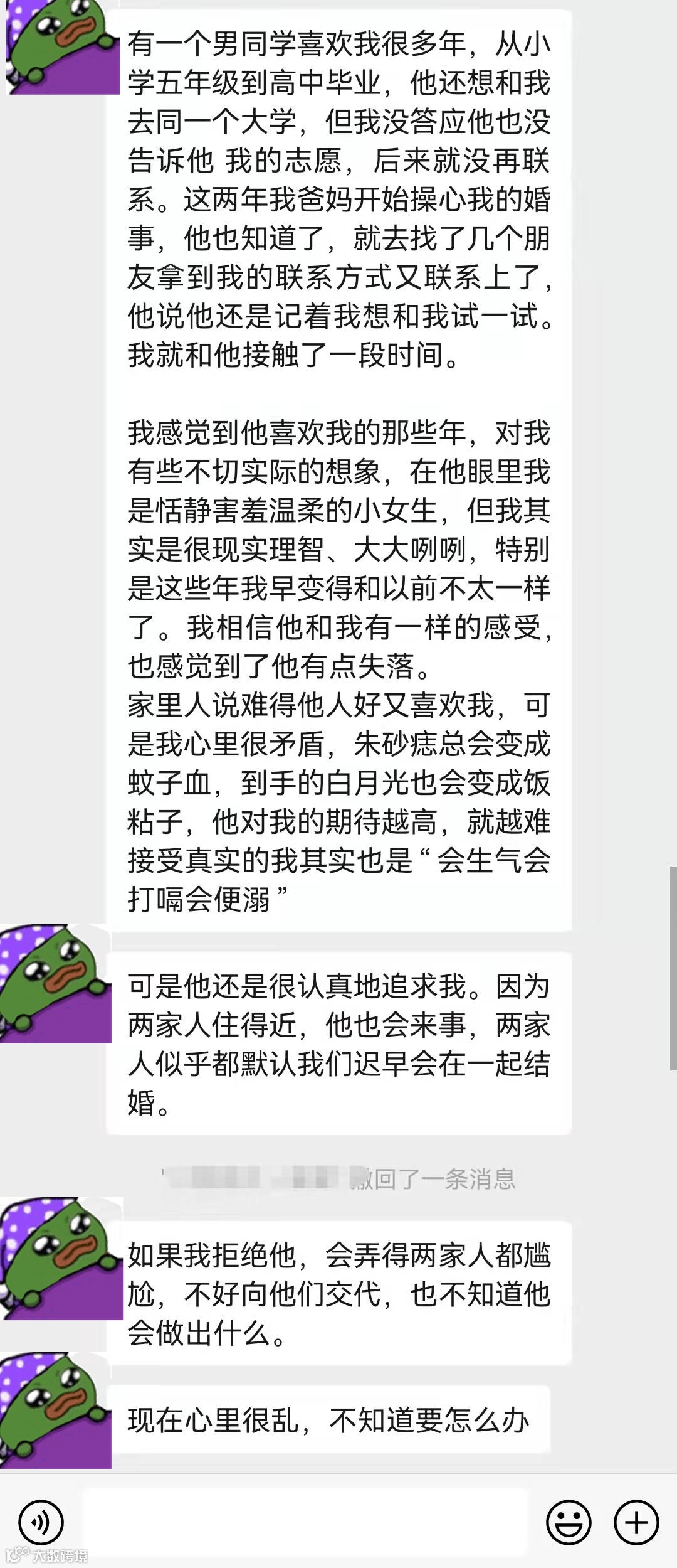 【匿名故事屋】有一个男同学喜欢我很多年,从小学五年级到高中毕业。最近他又联系上我,说他还是记着我想和试一试,接触一段时间后,两家人都认识了以为我们迟早会在一起结婚。可是我感觉他喜欢的不是我,而是对我的幻想,我心里很矛盾,一方面不想让家人失望,另一方面又担心朱砂痣变蚊子血。心里乱得很,不知道该怎么办?