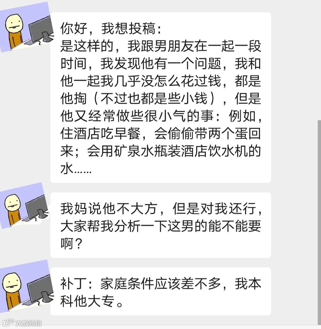 投稿女生说:男朋友对她还挺好的,但是他又经常做一些很小气的事。她想知道这样的男朋友,应不应该要?