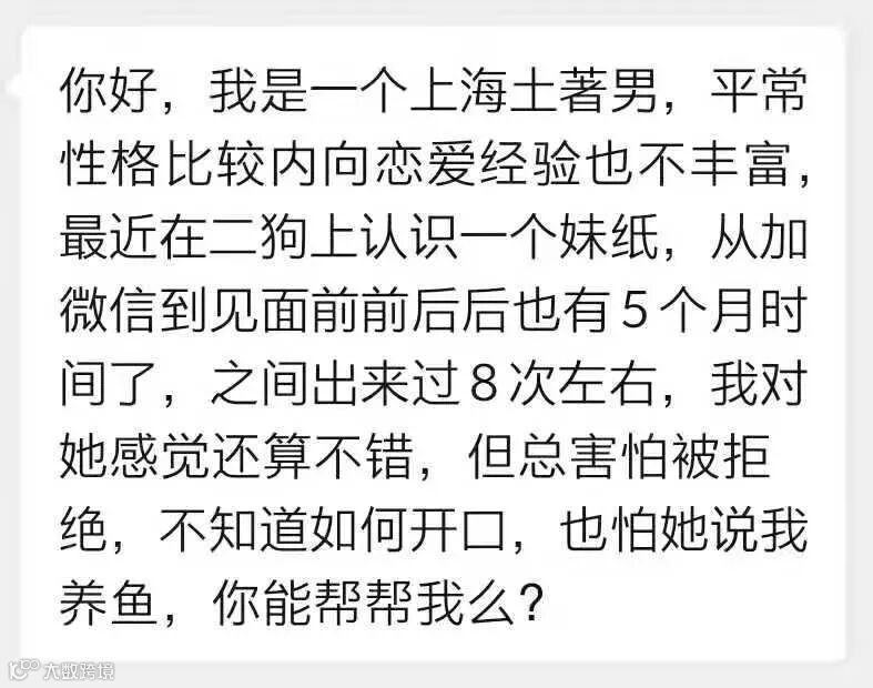 一位男生投稿说,他与女生认识5个月,约会8次,对她感觉还不错。但他性格较内向,恋爱经验不丰富,不知道如何开口表白,也害怕被拒绝。又怕一直拖着,女生觉得他在“养鱼”。