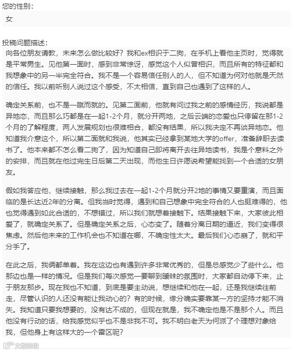 在二狗上遇到了灵魂伴侣,见第一面的时候感到似曾相识,并且他所有的特征都和我想象中的另一半完全符合,非常喜欢,所以在一起了。在此之前他告诉过我,他已经拿到某大学的offer,一两个月后就要异地,而且未来会在哪里工作也是不确定的。