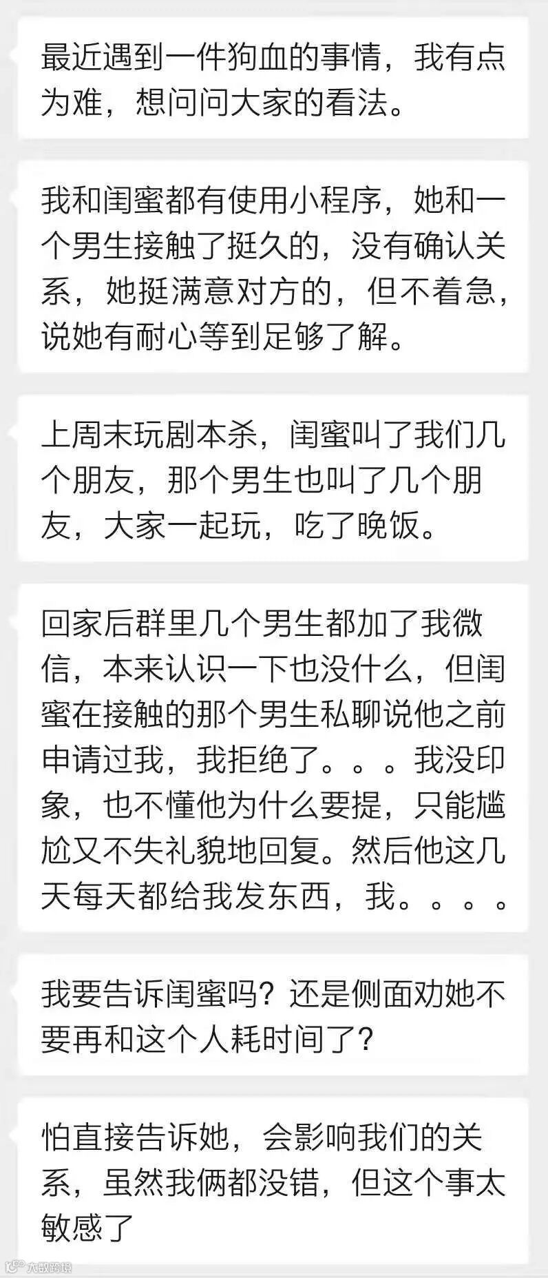 女生感觉到男生在“撩”自己,她很为难,不知道该直接告诉闺蜜,还是侧面劝闺蜜不要再和这个男生耗时间。她担心直接和闺蜜说,事情有些敏感,会影响两人之间的关系。