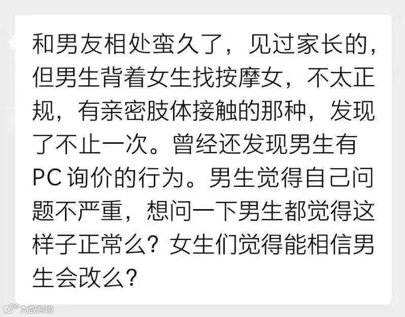 一位女生投稿说,她和男友交往挺久了,已经见过家长,但她发现男友不止一次背着她找按摩女,不太正规有亲密肢体接触的那种,还曾询价嫖娼。