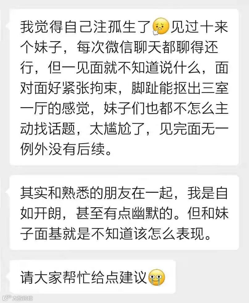 今天投稿的是一位男生,他见过十多个女生,但每次面基都非常紧张拘束尴尬,见完后均没有后续。