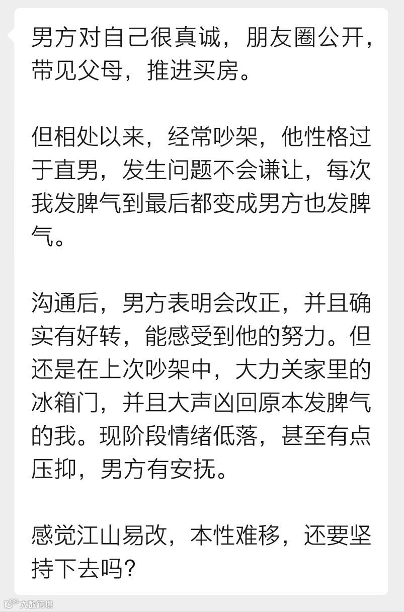 一位女生投稿说,她男友对她很真诚,朋友圈公开、带她见父母、推进买房事宜,但让她不满的一点是,男友性格过于直男,发生问题不懂谦让,每次她发脾气男友也会发脾气,两人经常吵架。