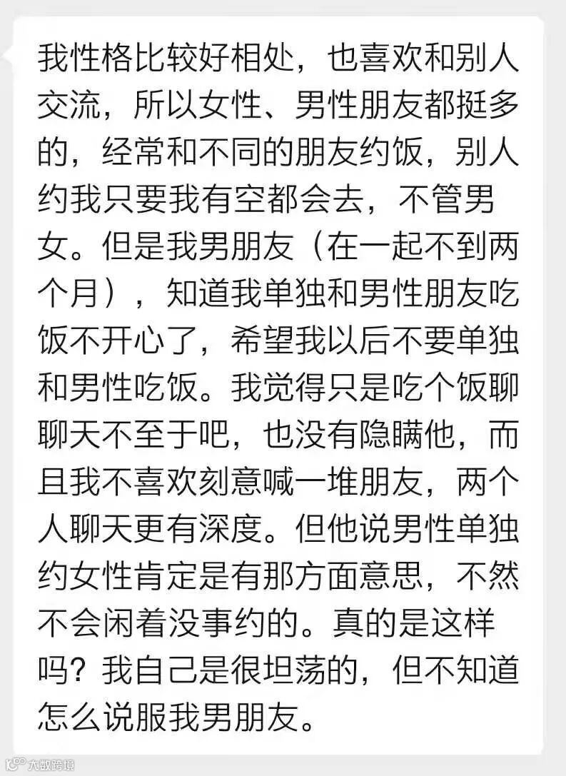 但是她男友知道她单独和男性朋友吃饭后不开心了,说男性单独约女性肯定是有“那方面”意思,希望她以后不要再单独和男性吃饭。