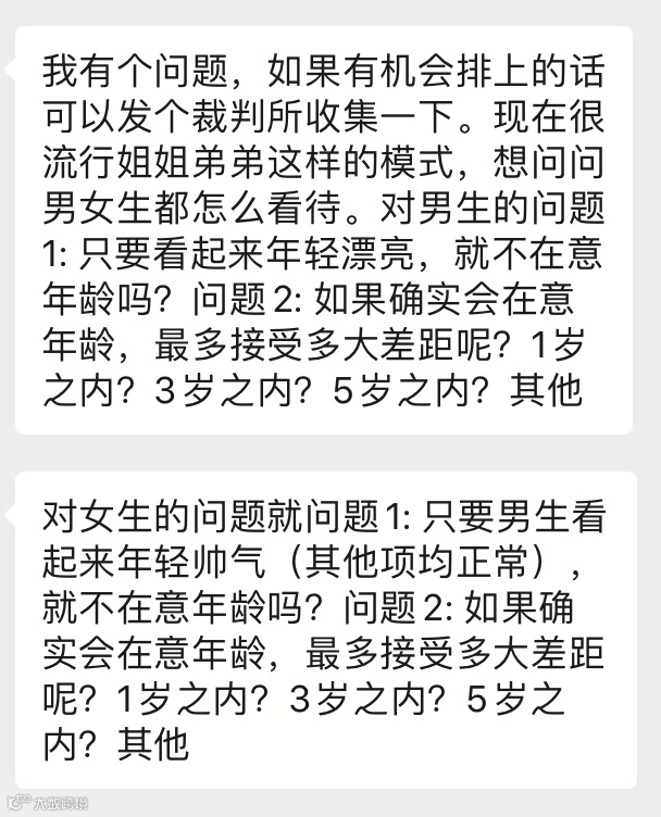 一位用户希望在裁判所调研一下,多少男女生能接受姐弟恋的形式?如果接受,能接受的年龄差距是多大?欢迎大家投票和留言发表看法。