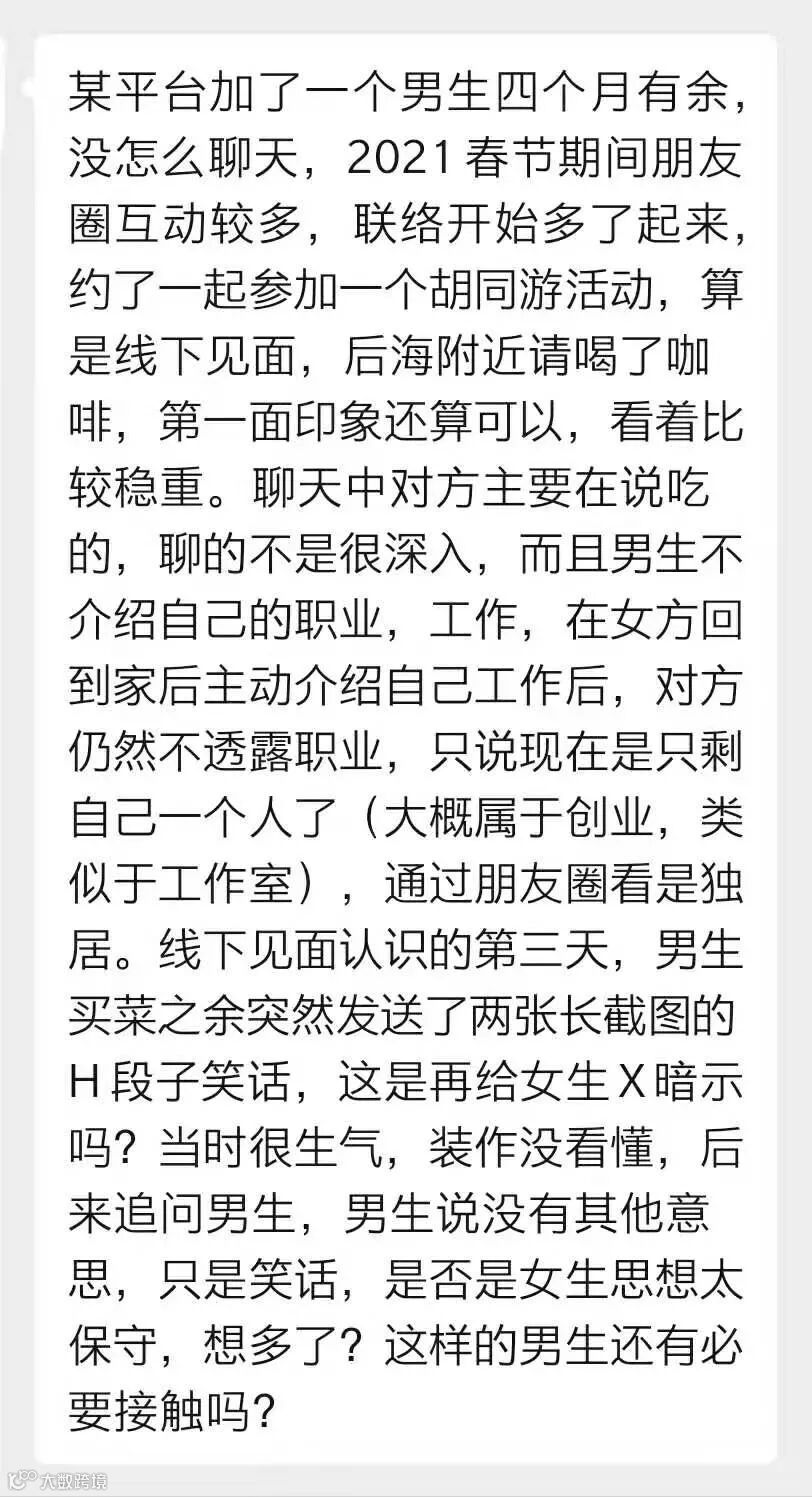 但有两点令女生感到不对劲,一是男生没有介绍自己的职业,女生主动介绍自己的后,男生依然含糊其辞;二是见面后第三天,男生给女生发了两张黄段子笑话图,女生当时很生气,觉得这是性暗示,但装作没看懂,后来回过神问男生,男生说他没有其他意思,只是分享个笑话。