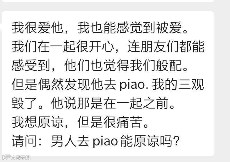 一位女生投稿说,她和男友很相爱,朋友们也觉得他们很般配。但是她偶然发现男友曾去嫖过,男友解释说那是和她在一起之前。女生觉得三观尽毁,想要原谅,又很痛苦。