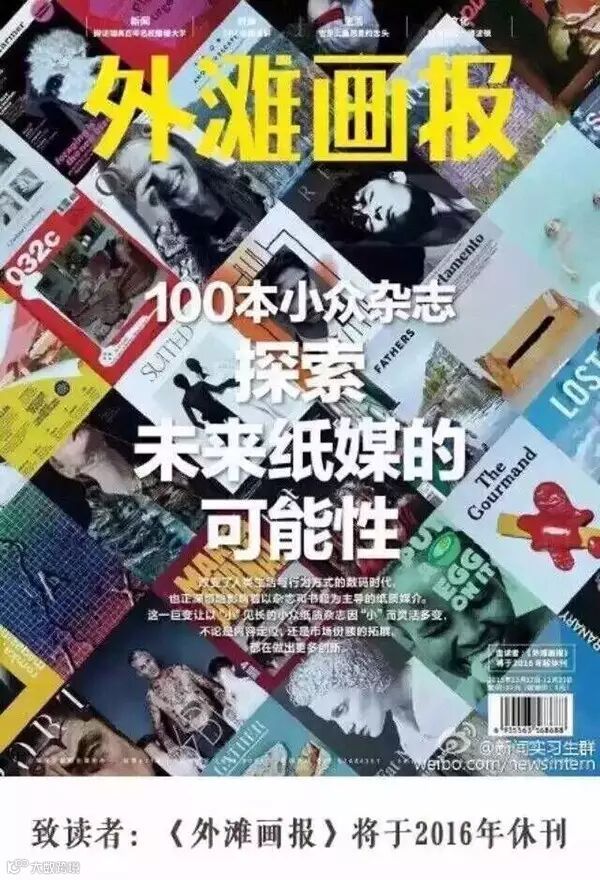 《外滩画报》近期发布了第673期,本期封面以《100本小众杂志探索未来纸媒的可能性》为标题。更引人关注的是封面右下角的一块小字:“告读者:《外滩画报》将于2016年休刊。”
