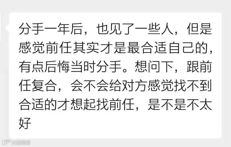 一位用户投稿说,ta和前任分手一年,见过一些异性后,感觉前任才是最适合自己的,有点后悔当初分手。