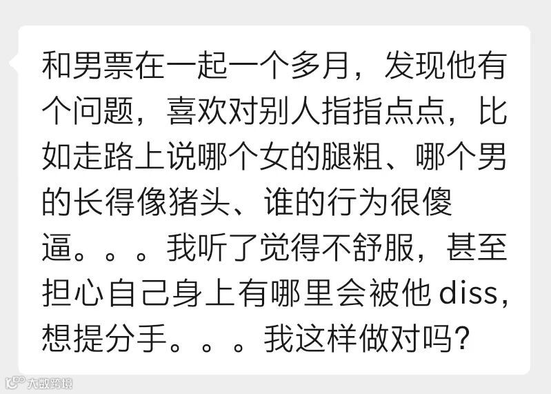 今天投稿的是一位女生,她和男友在一起一个多月,发现男友有个问题——喜欢对别人评头论足,比如走路上说某女生腿粗、某男生长得像猪头、某某的行为很傻等等。她听后觉得不舒服,想提分手,大家怎么看?欢迎投票和留言分享你的看法。