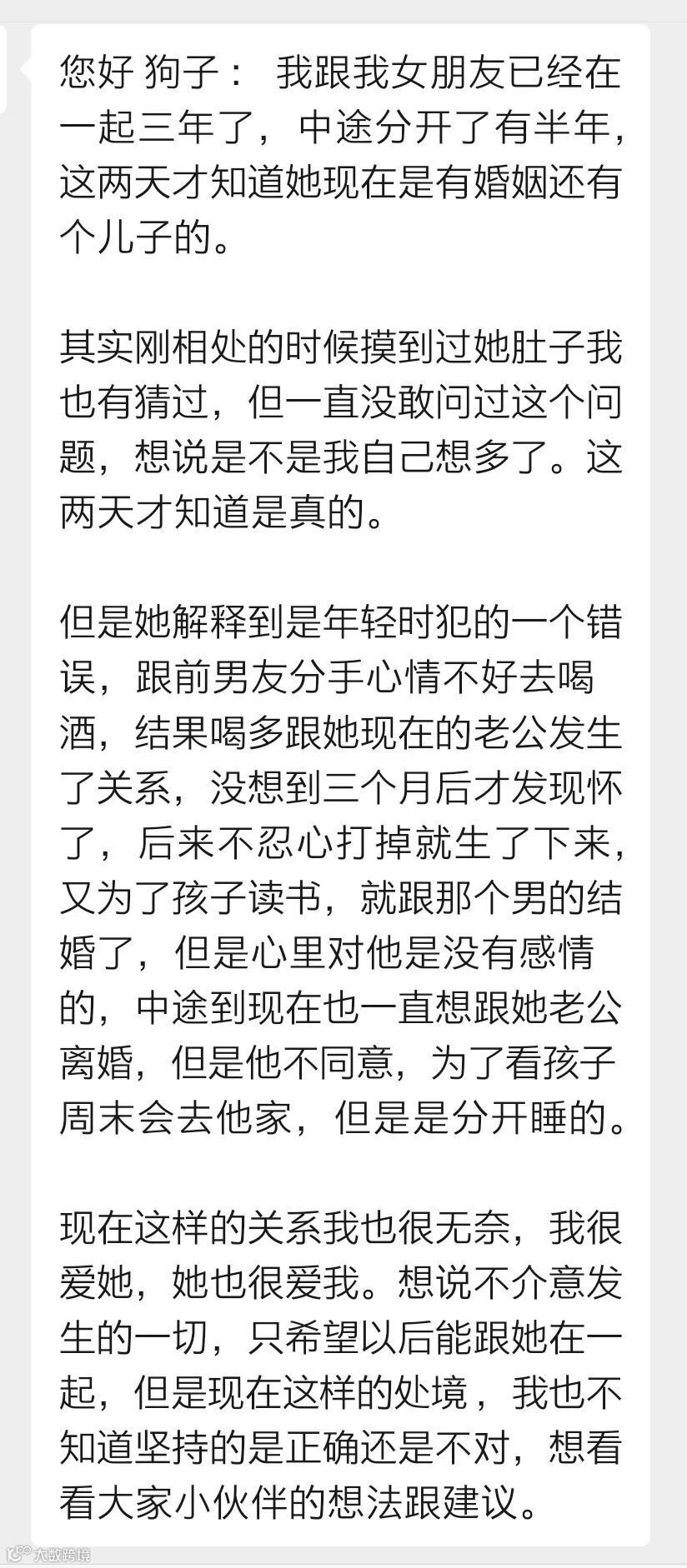 一位男生投稿说,他和女友在一起三年才知道她已婚有儿子,女友解释说是年轻时犯的一个错误,意外怀孕结婚,没有感情想离婚,但男方不同意,目前分居状态,仅周末去看孩子。