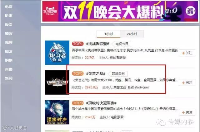 对于广告商来说,注意力就是商业价值。目前为止,大多数网络综艺节目都是采用和传统电视综艺类似的录播模式,本质上与传统电视节目并无不同,却忽略了网络综艺最核心的要素——即时性。而作为一档直播模式的节目,《荣誉之战》则通过瞬间的集群效应,让注意力经济在很短的时间内达到峰值。