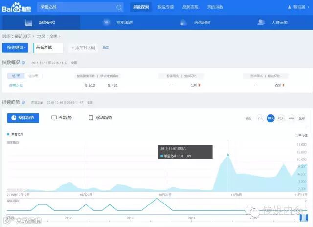 《荣誉之战》开播后,#荣誉之战#成为网络热词,微博话题阅读量达4180.2万,粉丝的助推下,话题榜单攀升至第二名,百度指数也在11月7日播放时达到过万点的峰值高峰。