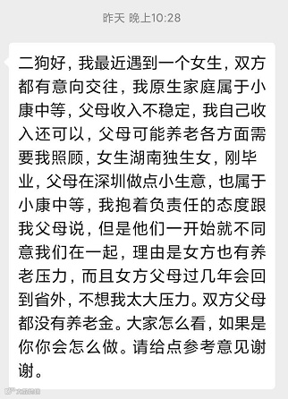 投稿男生的父母属于收入不稳定、没有养老金的类型,将来需要他照顾养老。而女生是湖南人,独生女,父母在深圳做点小生意,未来也没有养老金。男生父母觉得如果两人在一起,双方父母都没有养老金的话,他会压力很大,所以不同意他们在一起。