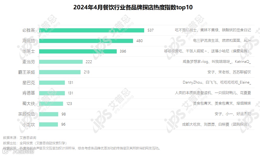 图3.2024年4月餐饮行业各品牌探店热度指数top10