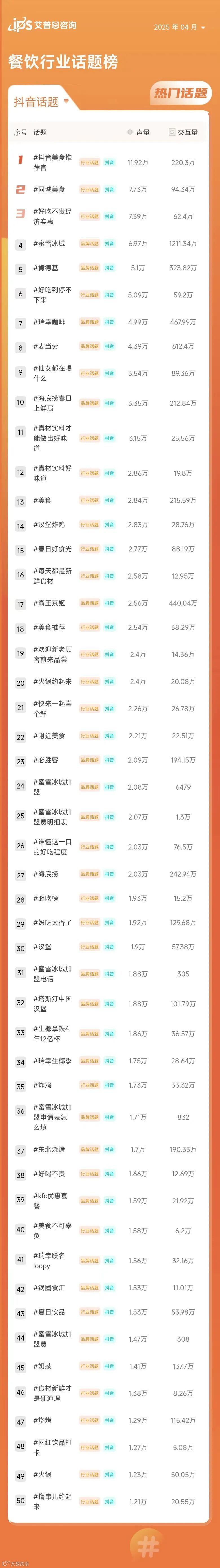 2025年4月餐饮行业排名前三的热门话题为:#抖音美食推荐官(行业话题,声量11.97万,交互量220.33万)、#霸王茶姬全球健康合作伙伴王鹤棣(品牌话题,声量7.99万,交互量0.91万)、#同城美食(行业话题,声量7.74万,交互量94.34万)。