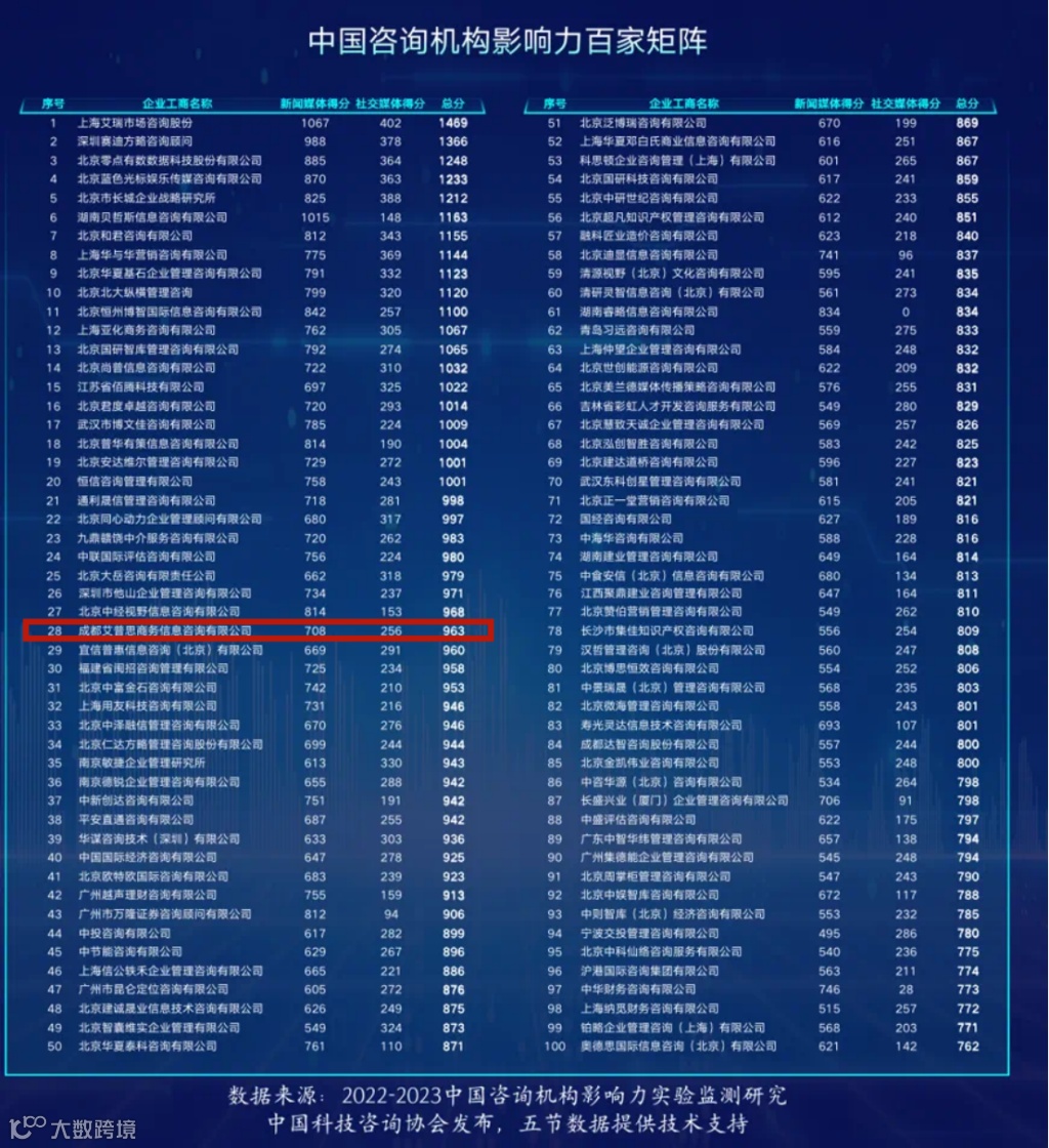2023年3月30日,中国科技咨询协会发布“中国咨询机构品牌影响力百家矩阵”,成都艾普思商务信息咨询有限公司(以下简称“艾普思咨询”)入选,名列第28位。