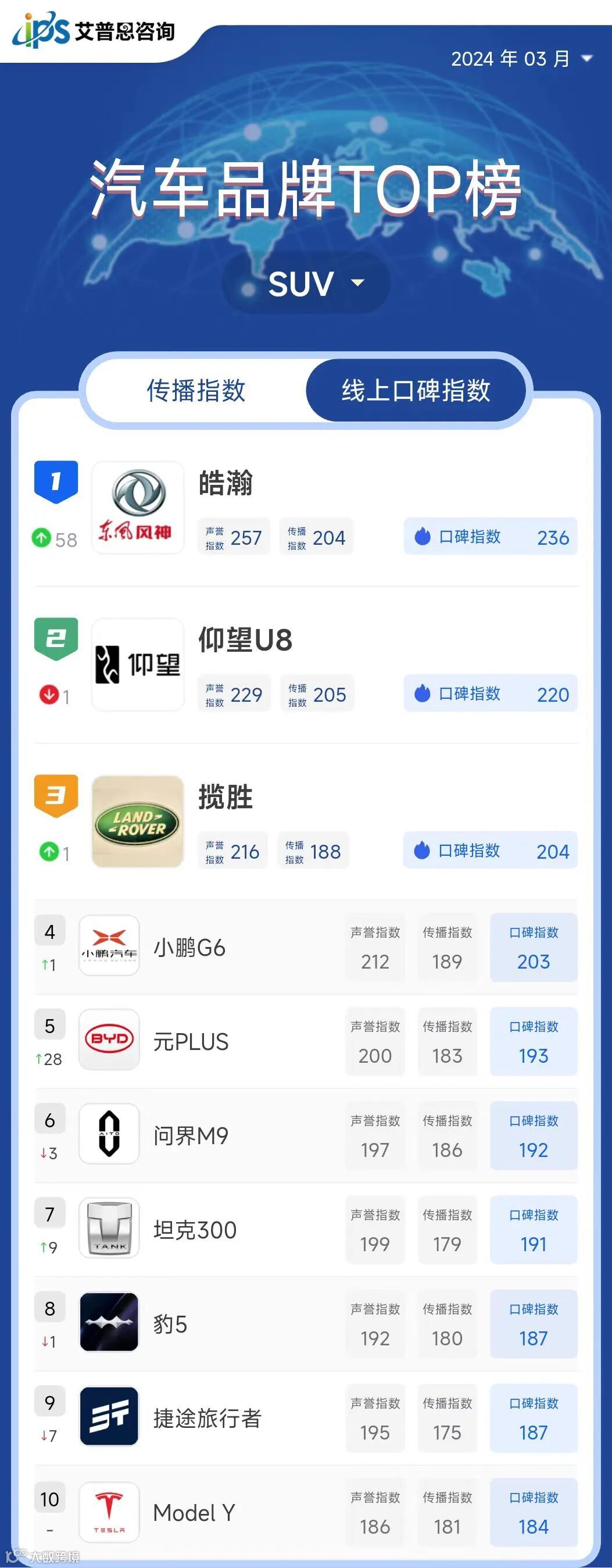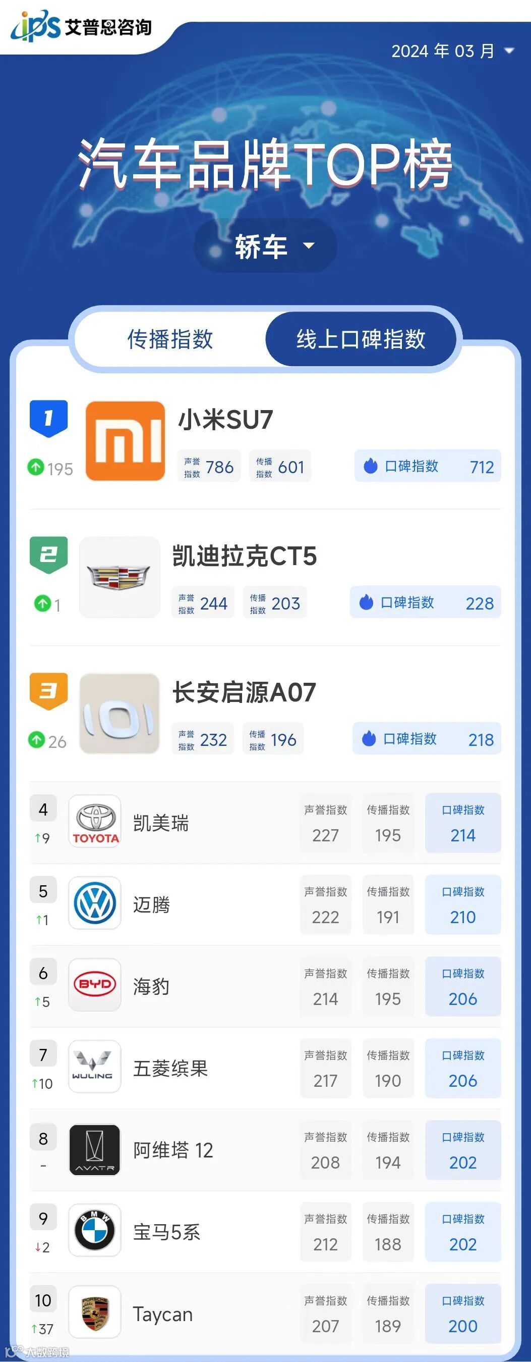 艾普思指数|首发:2024年02月中国汽车品牌线上口碑指数TOP50