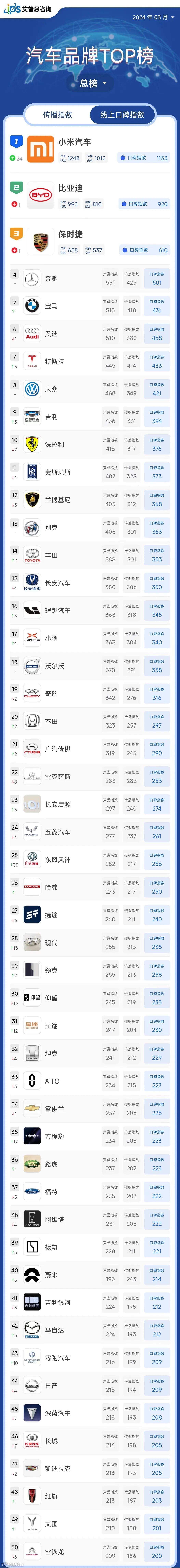3月线上口碑指数排名前三的汽车品牌为:小米汽车(口碑指数1153,排名较上月上升24位)、比亚迪(口碑指数920,排名较上月下降1位)、保时捷(口碑指数610,排名较上月下降1位);