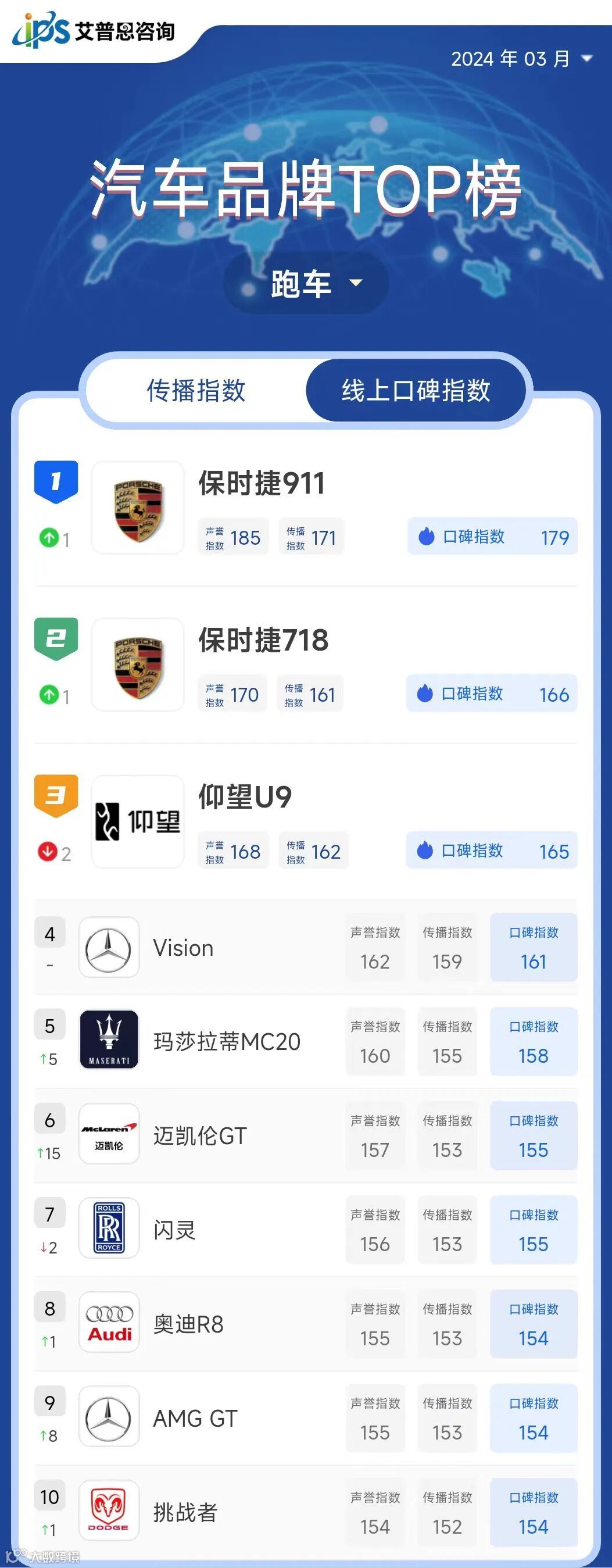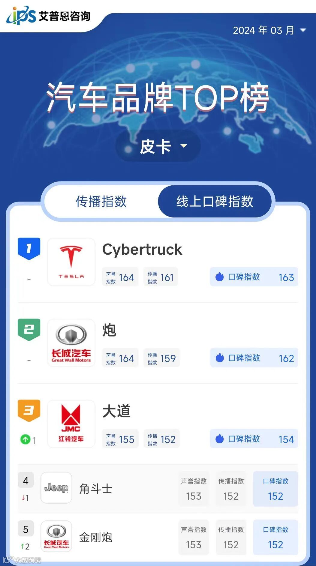 线上口碑指数排名前三的跑车车型为:保时捷911、保时捷718、仰望U9;线上口碑指数排名前三的皮卡车型为:Cybertruck、炮、大道*。