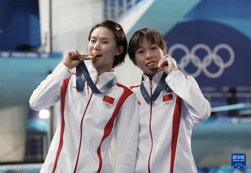奥运会跳水女子双人10米跳台决赛中,中国组合陈芋汐/全红婵再次上演“水花消失术”,以近乎完美的表现摘得金牌,这也是中国跳水队在本届奥运会上获得的第3金。(图片来源:新华社)