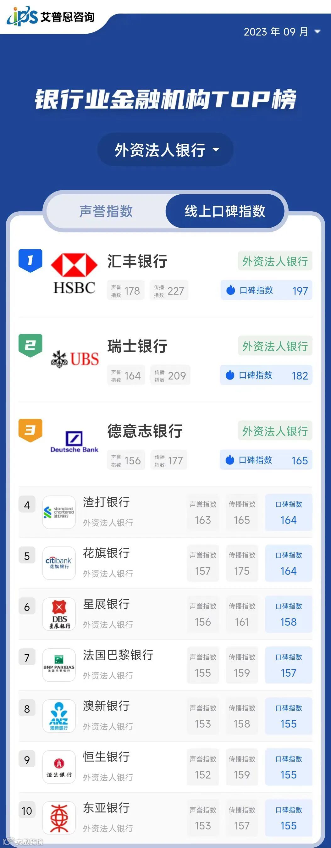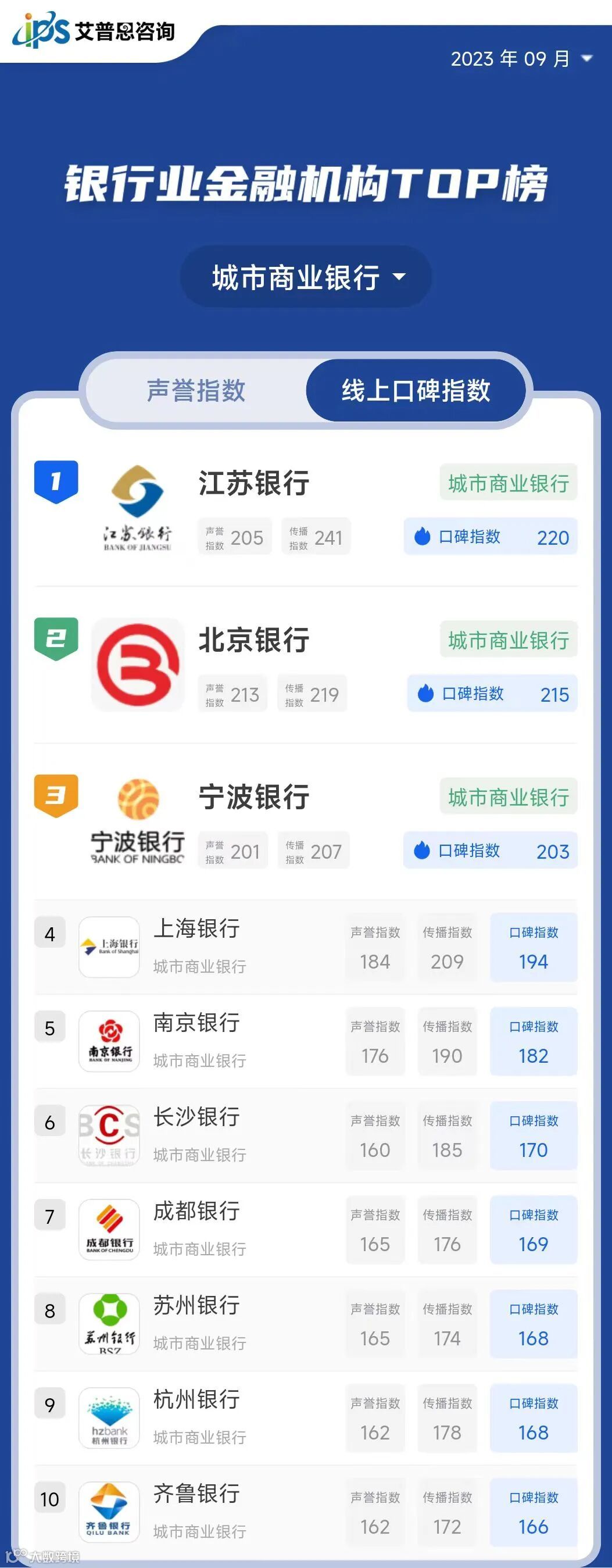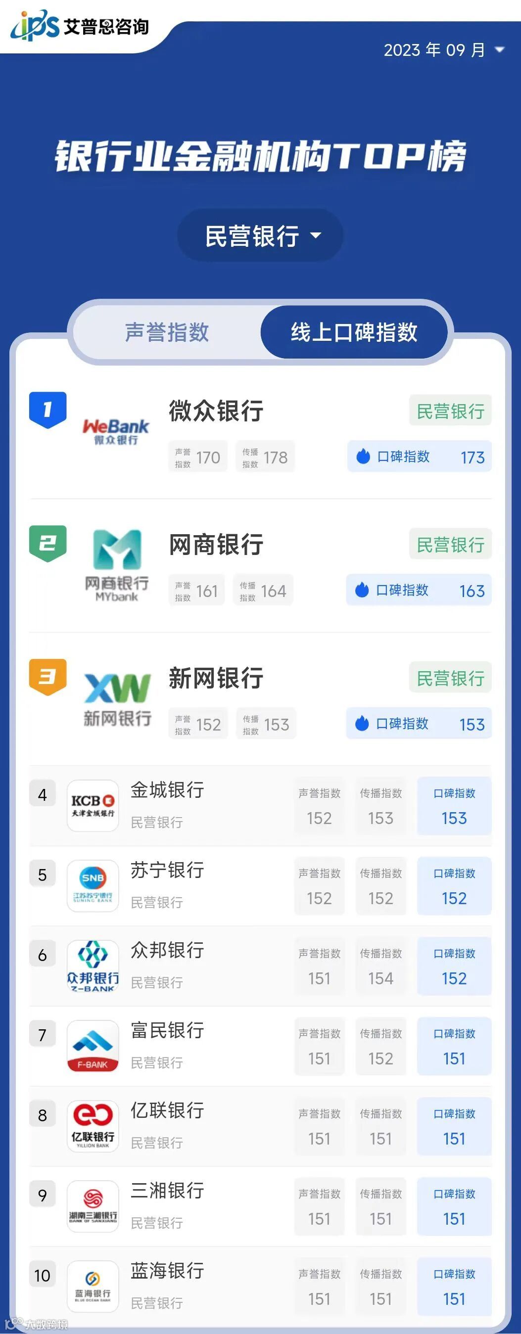 线上口碑指数排名前三的国有大型商业银行为:工商银行、中国银行、建设银行*;线上口碑指数排名前三的股份制商业银行为:平安银行、招商银行、中信银行;线上口碑指数排名前三的城市商业银行为:江苏银行、北京银行、宁波银行;线上口碑指数排名前三的民营银行为:微众银行、网商银行、新网银行;线上口碑指数排名前三的外资法人银行为:汇丰银行、瑞士银行、德意志银行*。