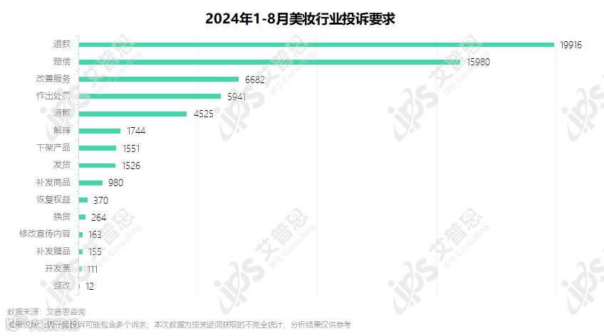 2024年1-8月美妆行业投诉缘由及要求
