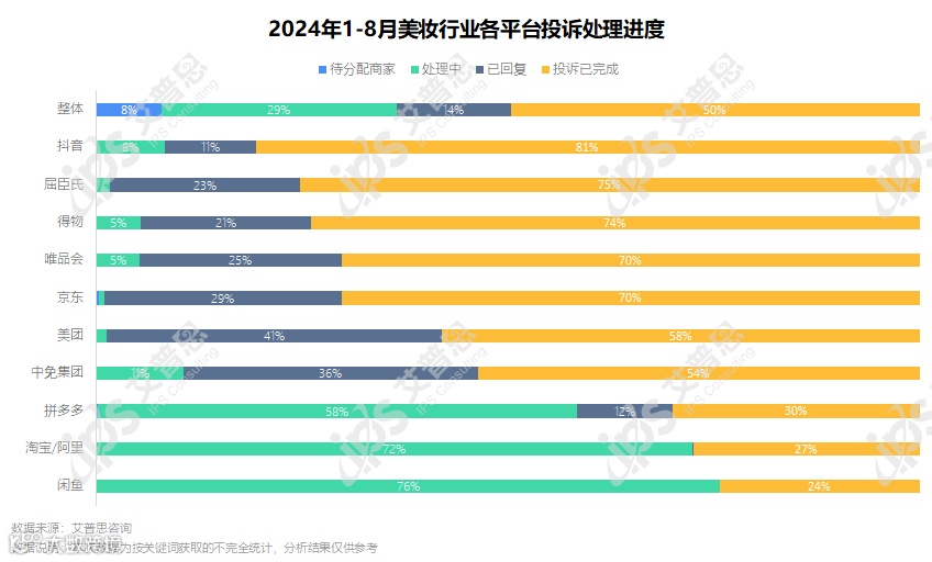 2024年1-8月美妆行业投诉处理进度及满意度