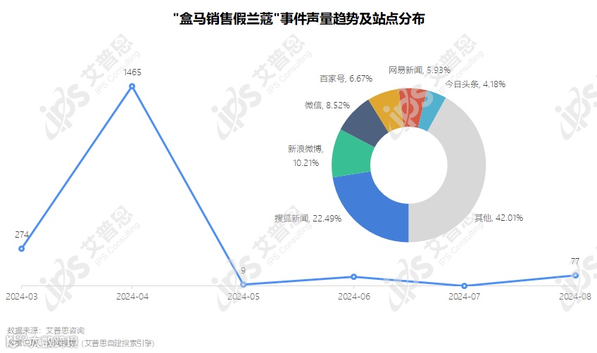 图12:“盒马销售假兰蔻”事件声量趋势及站点分布