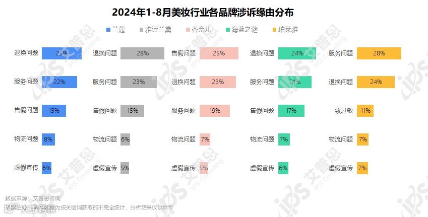 从投诉缘由来看,退换问题、服务问题、物流问题相关投诉较为普遍。此外,香奈儿涉及售假问题较多(25%),其中假香水相关投诉占比47%,假口红/唇釉相关投诉占比13%;珀莱雅被投诉产品致过敏较多(11%)。