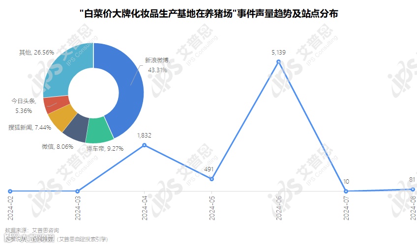 图13:“白菜价大牌化妆品生产基地在养猪场”事件声量趋势及站点分布