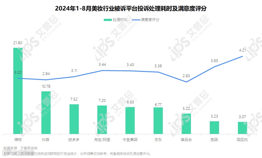 图10:2024年1-8月美妆行业被诉平台投诉处理耗时及满意度评分