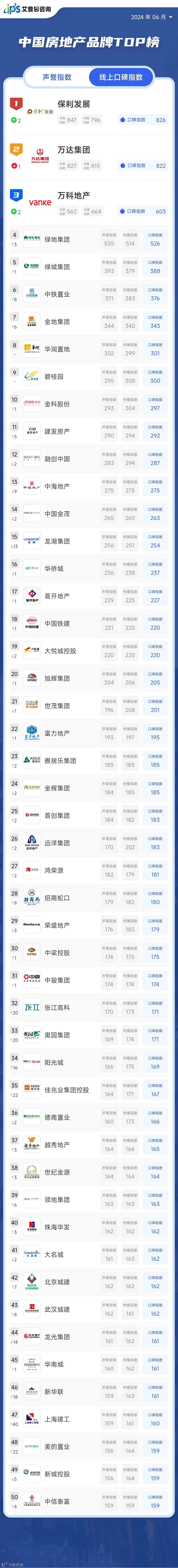 艾普思指数 | 2024年05月中国房地产品牌线上口碑指数TOP50