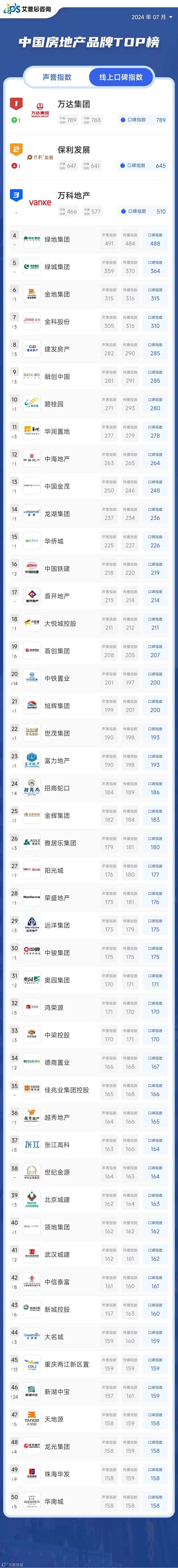 艾普思指数 | 2024年06月中国房地产品牌线上口碑指数TOP50