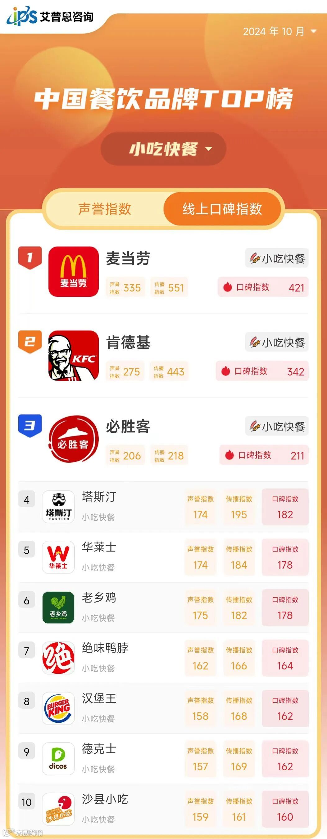 10月线上口碑指数排名前三的餐饮品牌为:海底捞(火锅/串串,口碑指数451,排名与上月持平)、麦当劳(小吃/快餐,口碑指数421,排名与上月持平)、肯德基(小吃/快餐,口碑指数342,排名较上月上升2位)。