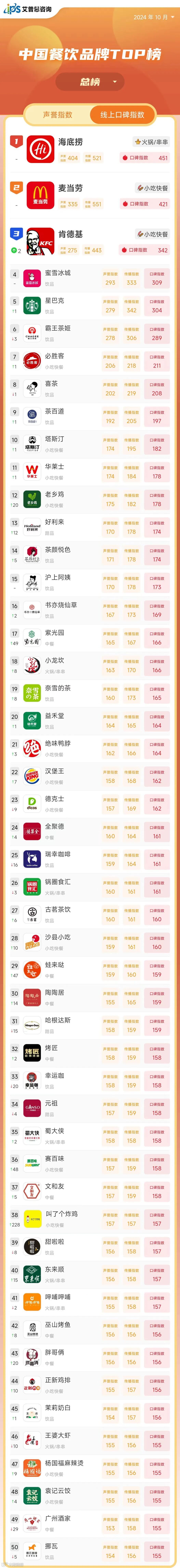 线上口碑指数排名前50的餐饮品牌中,包括火锅/串串品牌8个、小吃/快餐品牌14个、甜品品牌3个、中餐品牌9个、饮品品牌16个。