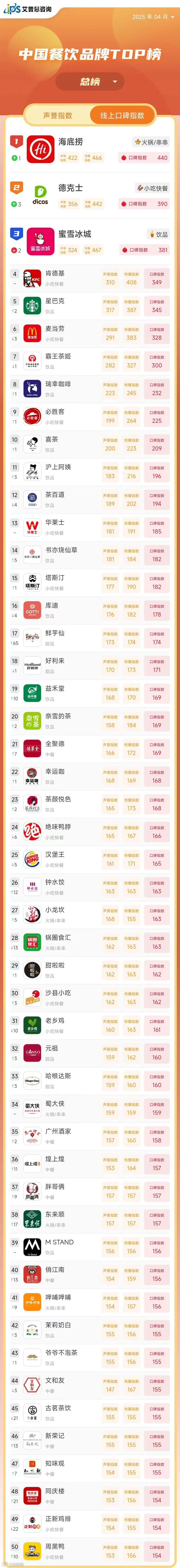 线上口碑指数排名前50的餐饮品牌中,包括火锅/串串品牌6个、小吃/快餐品牌13个、甜品品牌4个、中餐品牌9个、饮品品牌18个、西餐品牌0个。