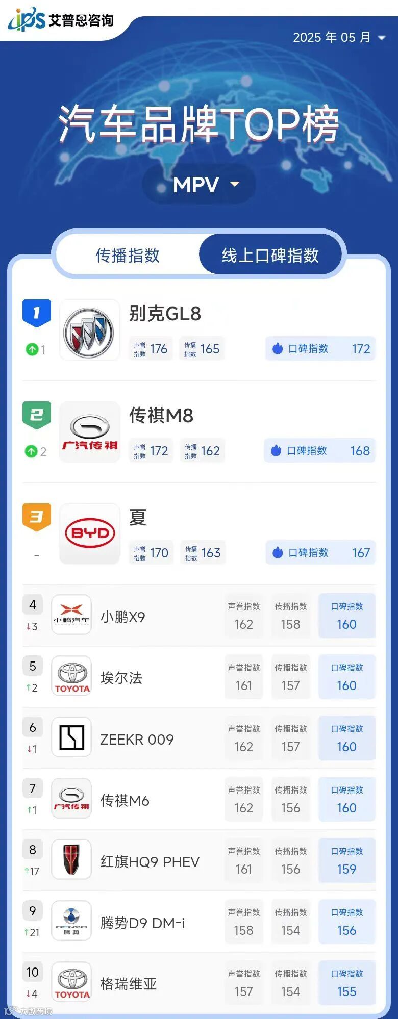 MPV线上口碑指数TOP10
