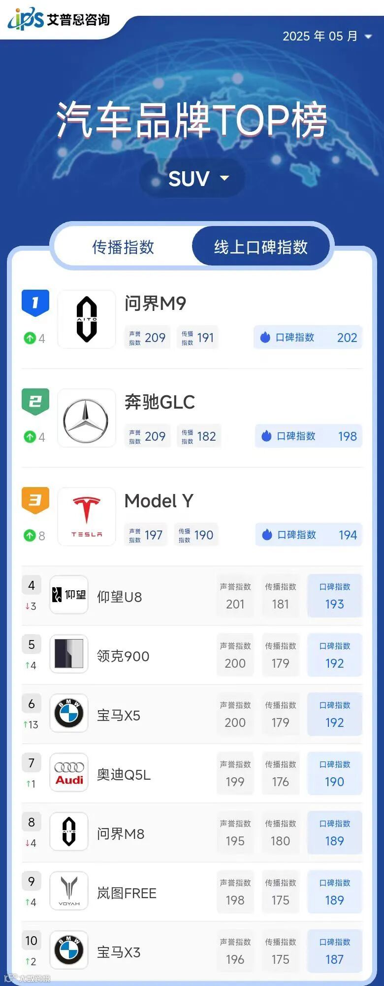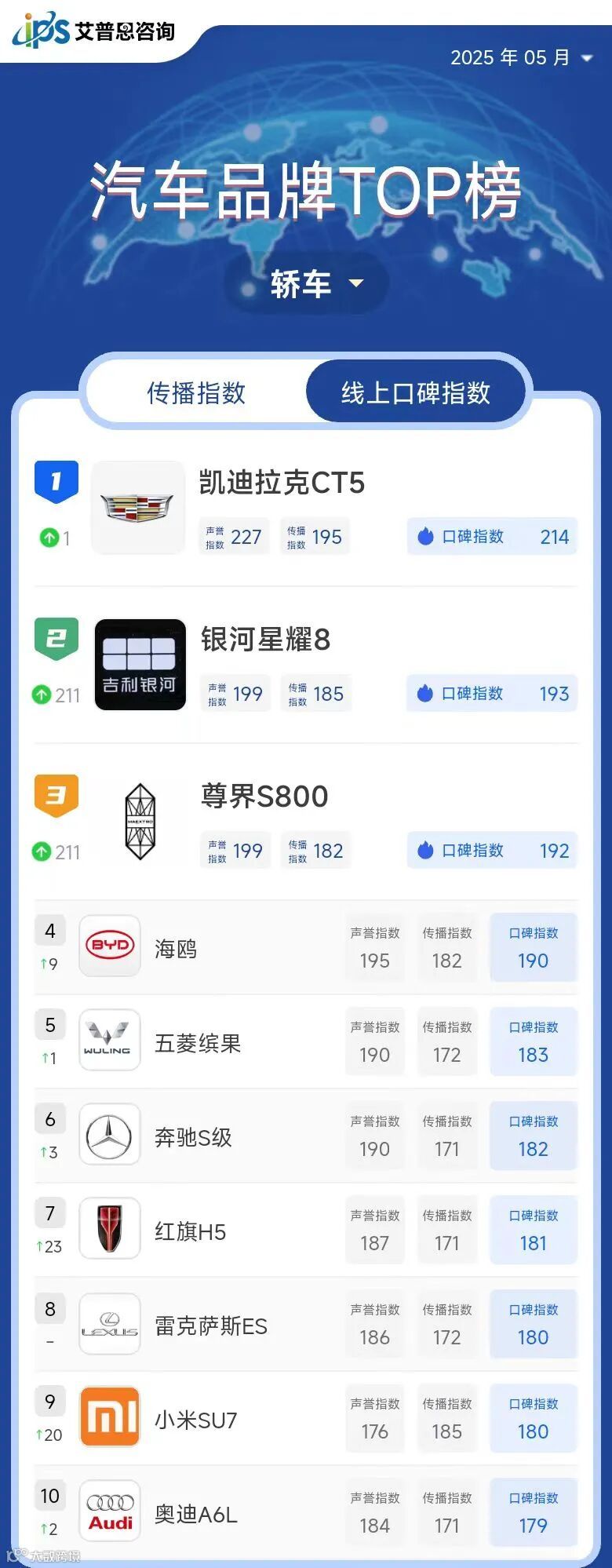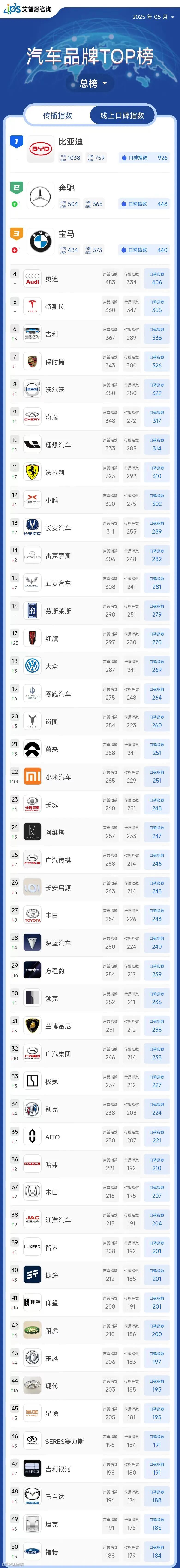 艾普思指数|2025年04月中国汽车品牌线上口碑指数TOP50