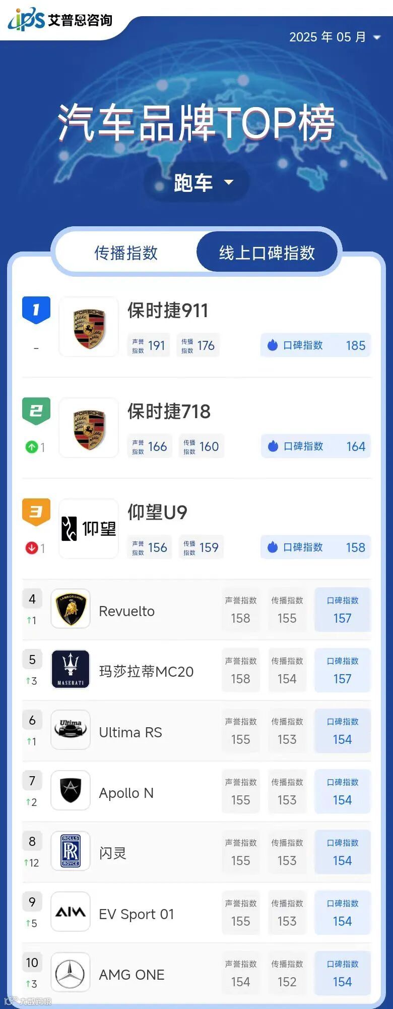 跑车线上口碑指数TOP10