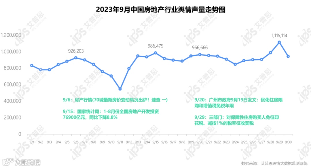 艾普思舆情大数据监测系统显示,9月,涉及房地产行业的舆情声量为26,500,694篇次,较上月小幅下降(8月舆情声量28,927,222篇次),日均声量达883,356篇次。其中,声量极值出现在9月29日(单日声量1,115,114篇次),主要受《三部门:对保障性住房购买人免征印花税、减按1%的税率征收契税》《一线城市“认房不认贷”满月 楼市成交冲高回落》等报道的影响。