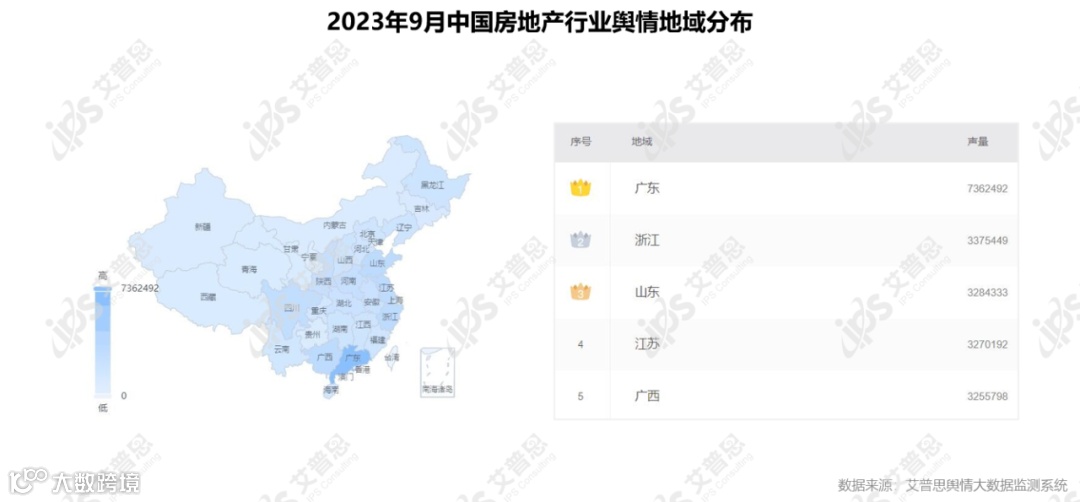 9月,房地产行业舆情涉及广东、浙江、山东等31个省市。其中,排名第一的为广东省,舆情声量达7,362,492篇次;排名第二的为浙江省,舆情声量达3,375,449篇次;排名第三的为山东省,舆情声量达3,284,333篇次。31省市舆情声量分布情况如下: