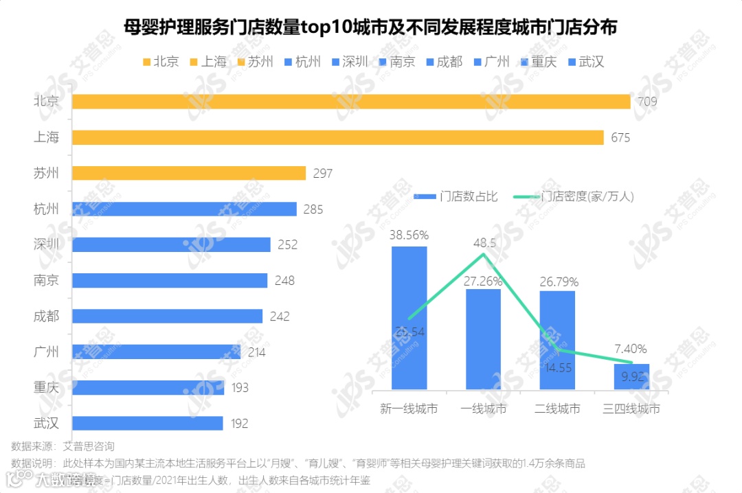 图2:母婴护理服务门店数量top10城市及不同发展程度城市门店分布